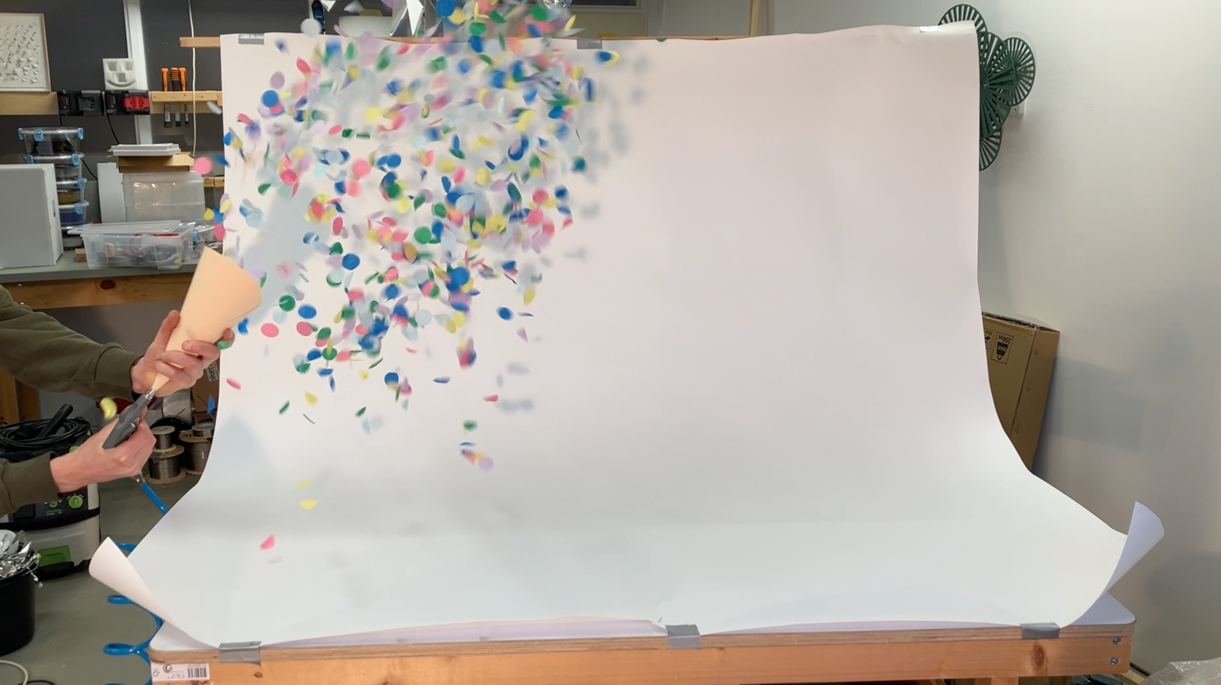 Met de titel wordt ook gesuggereerd dat er achter de schermen een nauwgezet proces heeft plaatsgevonden. We zien de kunstenaar in het atelier, poging na poging met handenvol confetti om de perfecte wolk te maken. Apparatuur om te scannen en vast te leggen. De opname stilzetten, het moment onderzoeken, inzoomen en uitvergroten. En dan hier zorgvuldig namaken.